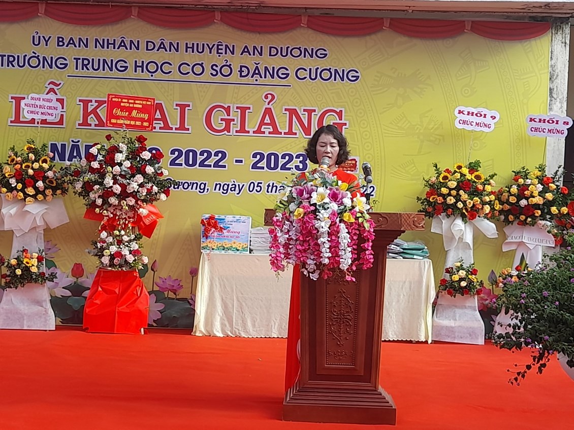 Nhân dịp Lễ khai giảng năm học mới, thay mặt cho trường THCS Đặng Cương, cô giáo Nguyễn Thị Anh Vân cảm ơn sự quan tâm, giúp đỡ, tạo điều kiện của cấp ủy - chính quyền các cấp; các tổ chức đoàn thể chính trị - xã hội; các doanh nghiệp, nhà hảo tâm và quý phụ huynh học sinh trong năm học 2021 - 2022. Bước vào năm học 2022 - 2023, cô Nguyễn Thị Anh Vân cũng mong rằng các cấp ủy - chính quyền, nhà trường mong muốn các tổ chức chính trị - xã hội tiếp tục quan tâm và chăm lo đến sự nghiệp giáo dục của xã nhà; các phụ huynh học sinh, các doanh nghiệp; các mạnh thường quân hỗ trợ cho nhà trường về nhân lực, vật lực, trí lực để xây dựng một môi trường giáo dục tốt nhất cho các em học sinh.